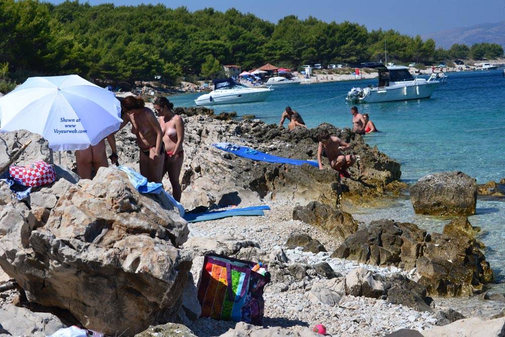 & in Croatia, on a non nude beach. They are not disturbed by other people from the beach. The beach was full with dressed people and some boats in the sea.